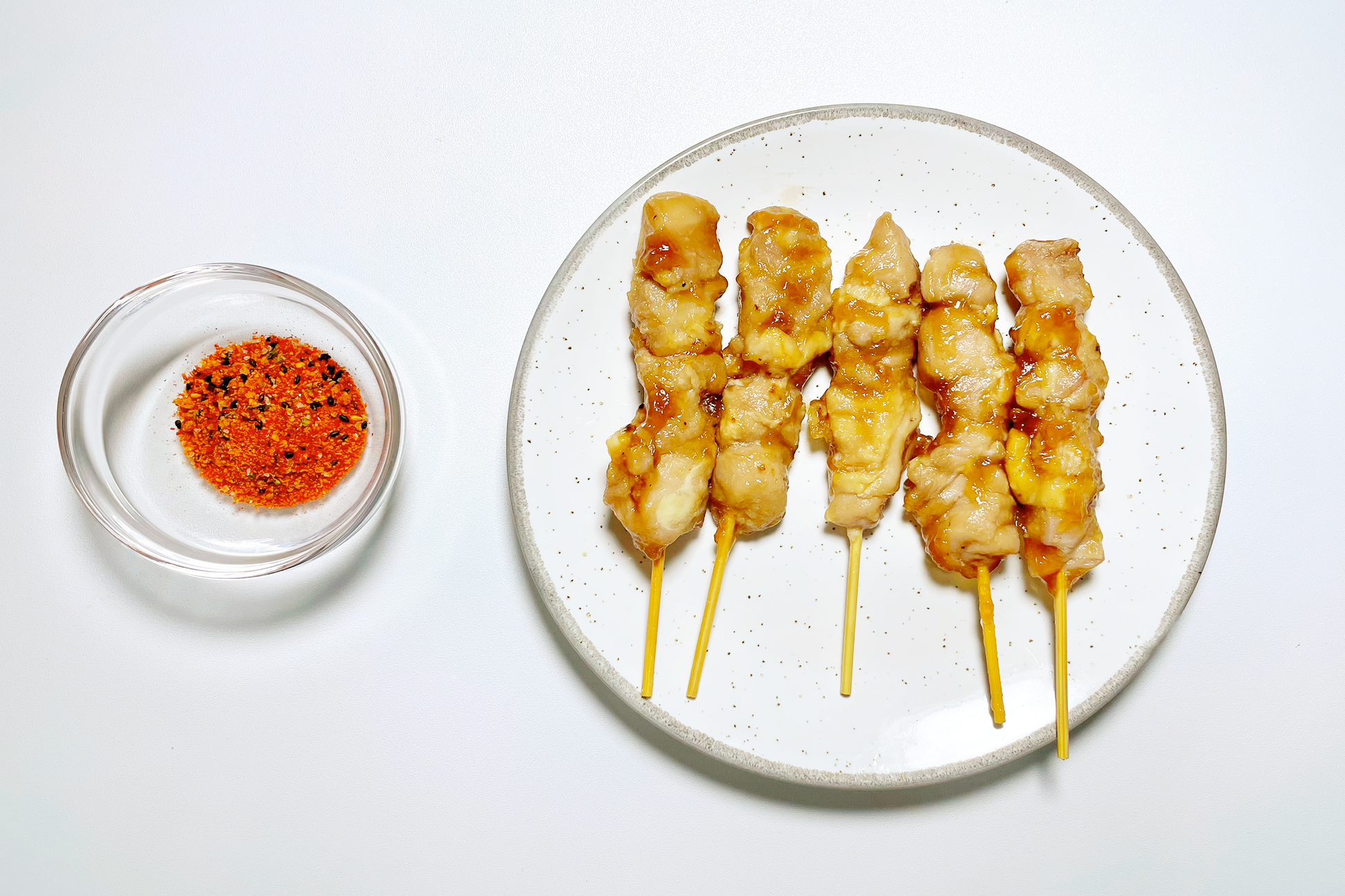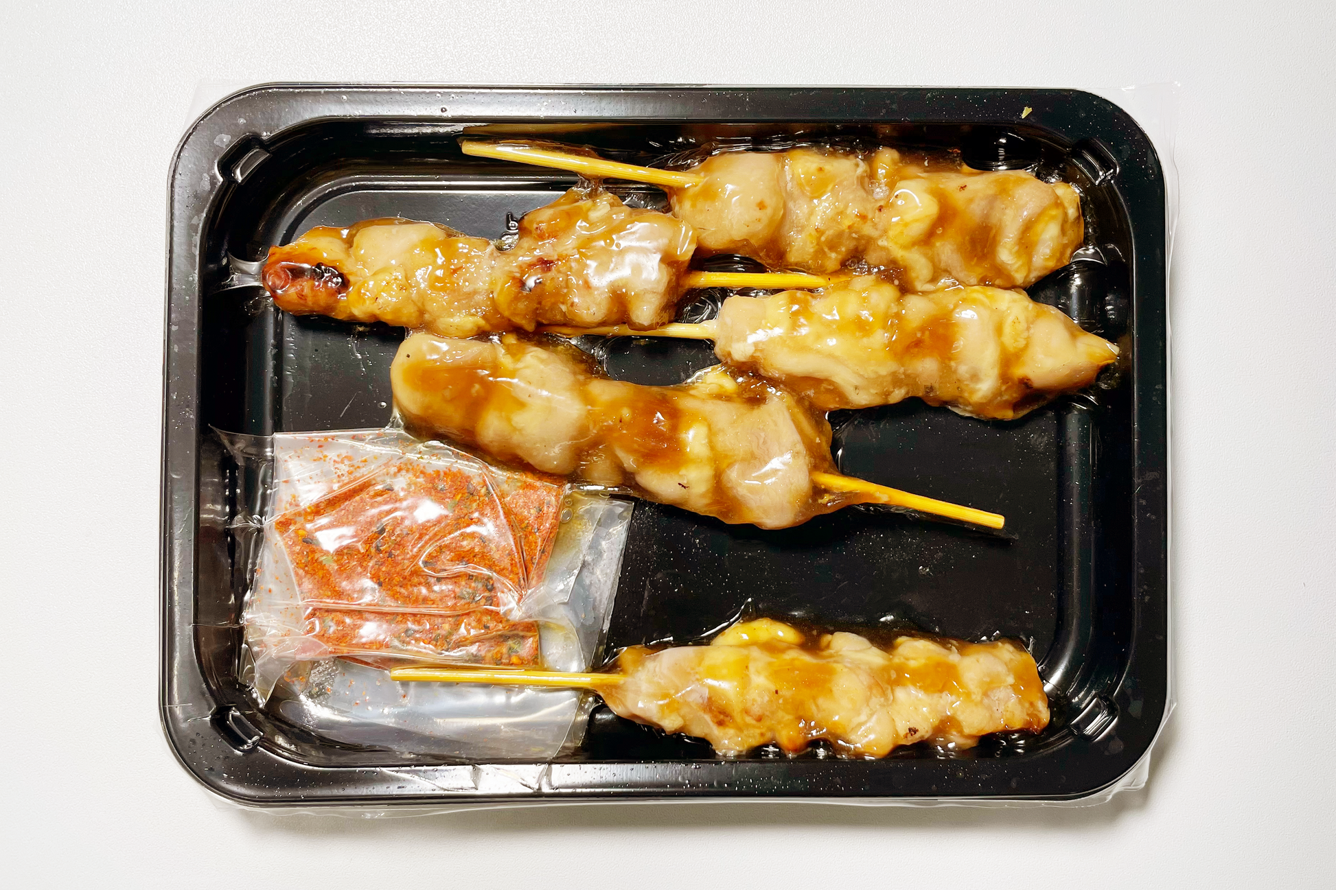 Ingredient: Yakitori Chicken Skewers: Chicken,Soy sauces (Soybean, Wheat, Salt), Glucose syrup, Sugar, Starch (Tapioca, Potato), Sweet cooking rice wine [Glucose syrup, Glutinous rice, Alcohol, Rice, Koji (Aspergillus oryzae), E621, Modified starch, Salt, Vinegar (Rice, Sugar), D-xylose,E500(ii), E331(i), E150c. Shichimi Seasoning: Chilli Pepper, Orange Peel, Black Sesame Seed, Seaweed, White Sesame Seeds, Japanese Pepper, Ginger, Salt.